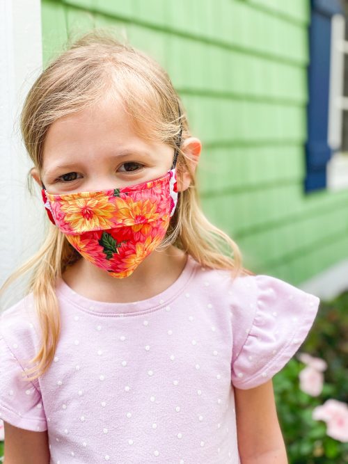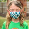-Three layers for extra safety: 2 cotton & an ironed on poly lining -ADJUSTABLE. One size fits most kids. Big kids can wear the adult size mask. -Designed to go around your head and neck with cord or elastic. -Nose wire on top for fit. -REUSABLE. Wash Daily. -Washer & Dryer safe